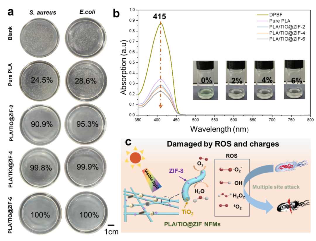 由于纳米介电质TiO2和ZIF-8在光照下展现出优异的光催化特性,能够释放具有抑菌活性的活性氧(ROS)。鉴于此优点,我们利用E. coli和S. aureus评估了PLA/TIO@ZIF NFMs的抑菌性能(图6)。可以明显的发现纯 PLA与PLA/TIO@ZIF NFMs 琼脂板上菌落的差异。相比之下,PLA/TIO@ZIF NFMs对两种细菌的抑菌效率都达到了100%,而纯 PLA 的抑菌效果并不明显。因此,PLA/TIO@ZIF NFMs表现出优异的杀菌能力。这给开发具有良好的抗菌性能的过滤膜提供了一个范例。