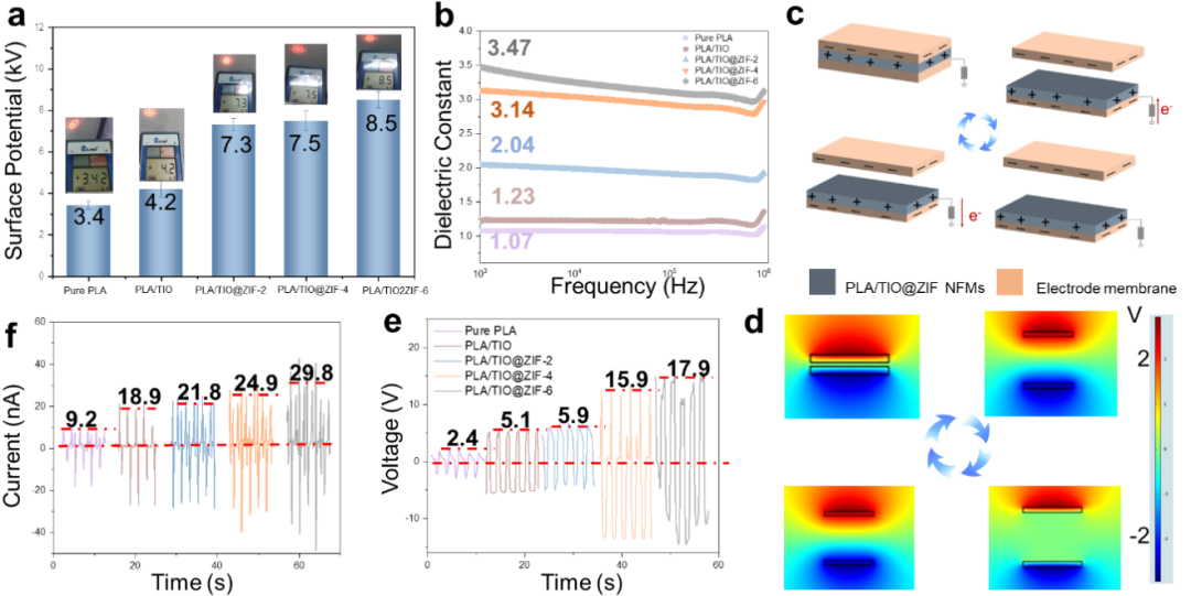 由于TiO2和ZIF-8纳米介电质的引入可以在电场力作用下增加PLA NFMs的表面自由电荷,并且两种纳米介电质的协同增益是显著的。引入TiO2纳米介电质后,PLA/TIO NFMs的表面电位由纯PLA的3.4 kV提高到4.2 kV。此外,当进一步引入ZIF-8纳米介质时,PLA/TIO@ZIF-6 NFMs增加到8.5 kV。由于固有的低极化特性,纯PLA NFMs的介电常数仅为1.07,而掺杂TiO2纳米介电质的PLA/TIO NFMs的介电常数增加到1.23。当进一步引入ZIF-8纳米介电质时,PLA/TIO@ZIF-6 NFMs增加到3.47 (图3)。在PLA基体中引入高介电常数的纳米介电质使得TiO2和ZIF-8本身、TiO2和ZIF-8纳米介电质之间发生相互作用以及TiO2和ZIF-8纳米介电质与PLA基体之间产生界面极化效应。随着纳米介电质负载量的增加,极化效应增强,介电常数显著提高。