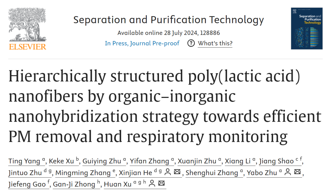 近日,中国矿业大学职业健康研究院何新健教授/徐欢副教授与中国安科院张明明主任、四川大学钟淦基教授、扬州大学高杰峰开展合作,在期刊《Separation and Purification Technology》,发表了最新研究成果“Hierarchically structured poly(lactic acid) nanofibers by organic-inorganic nanohybridization strategy towards efficient PM removal and respiratory monitoring”。在此,研究者提出了一种有机-无机纳米杂化策略,以同时提高PLA纤维膜的表面活性和电活性,通过共电纺丝-电喷雾技术来制备PLA/TIO@ZIF 纳纤膜(NFMs)。对于电纺无机TiO2纳米介电质,它可以提供强大的电子捕获能力,并提高摩擦层的表面电荷密度。对于电喷金属有机ZIF-8介电质,可以提供丰富的电荷捕获位点,显著提高PLA NFMs的电活性和介电常数。这种有机-无机纳米杂交策略不仅赋予了PLA NFMs高的摩擦电输出性能,而且提高了PLA NFMs的空气过滤和抗菌性能。