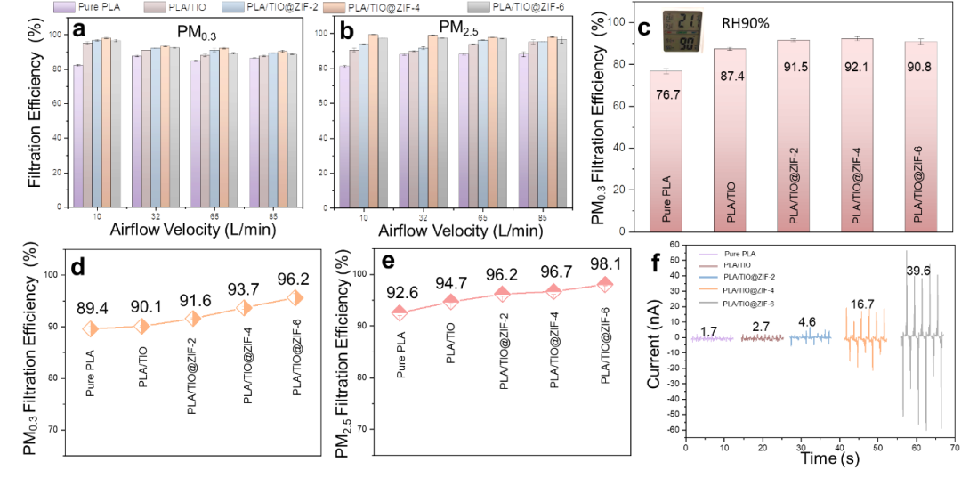 为了探究有机-无机纳米杂化策略的设计对其过滤性能带来的影响,在各个气体流速(10、32、65、85 L/min)下评价了过滤器的综合过滤性能(图5)。结果显示,PLA/TIO@ZIF NFMs实现了多种过滤机制,包括增强的物理拦截、极性相互作用和静电吸附,纯PLA NFMs的PM0.3和PM2.5过滤效率较低(86.4%,88.1%,276.5 Pa,85 L/min),而PLA/TIO@ZIF-6展现出较高的PM0.3和PM2.5过滤效率和较低的空气阻力(90.4%,97.8%, 175 Pa, 85 L/min),更重要的是,PLA/TIO@ZIF NFMs还表现出优异的抗湿性能(92.1%, RH90%, 32 L/min)。此外,作者进行摩擦充电实验探究了摩擦电性能对过滤效率的提升情况。结果发现,与传统PLA纤维膜相比,自供能PLA/TIO@ZIF NFMs具有高电活性,在规律的呼吸振动触发下表现出卓越的TENGs特性。在仿人呼吸振动(32 L/min)的激发条件下,PLA/TIO@ZIF NFMs对PM0.3和PM2.5的过滤效率分别高达96.2%和98.1%,PLA/TIO@ZIF-6 NFMs输出电流高达39.6 nA。