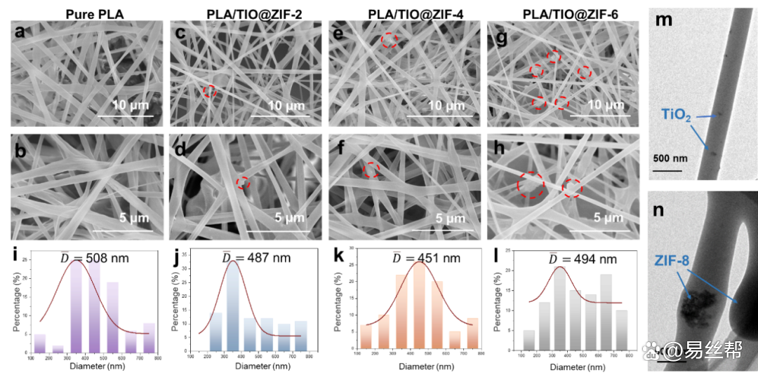 纤维的表面形态对膜过滤器的过滤性能有着重要影响。鉴于此,在电纺-电喷过程中,通过引入纳米介电质TiO2和ZIF-8来调节膜的形态,制备了不同纤维直径的NFMs。纯PLA纤维表面光滑,纤维之间相互粘附。引入介电质TiO2后,纤维开始细化,进一步引入ZIF-8介电质后,随着ZIF-8介电质的负载量增多,PLA/TIO@ZIF纤维表面嵌入的介电质逐渐增多,与纯PLA纤维相比,纤维表面出现微凸结构且直径进一步得到细化,实现了对纤维的形态的调控(图2)