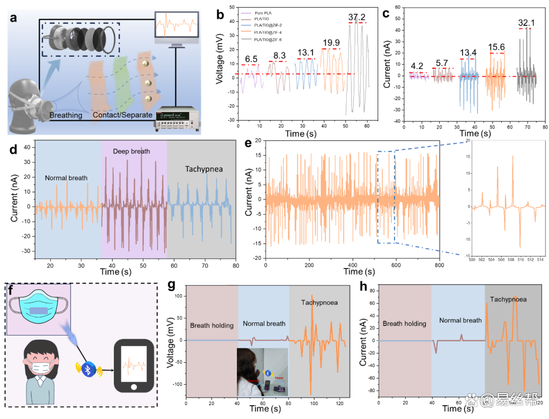 图4基于PLA/TIO@ZIF-TENG用于实时监测呼吸状态