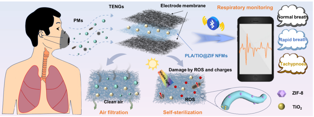 在这项研究中,研究者提出有机-无机纳米杂化策略,引入介电材料TiO2和ZIF-8 构建有机-无机纳米杂化体系。两种纳米介电质的掺入对提升PLA-TENGs的摩擦电输出性能具有显著的协同效应。该策略可以有效地存储摩擦电产生的电荷,减少电荷损失。TiO2和ZIF-8纳米介电质均为PLA NFMs提供了密集的电荷捕获位点,并扩展了电荷的移动路径,显著提高PLA FMs的表面活性、原位驻极性能和电荷再生功能。鉴于表面形态和电活性的充分调控,NFMs在表现出优异的PMs过滤性能和较低空气阻力的同时还具有优异的抗湿性。此外,NFMs具有优异的抗菌特性,基于NFMs的TENGs在高性能空气过滤装置和实时生理监测方面也显示出巨大的应用潜力。有机-无机纳米杂化策略有效地结合了呼吸保健和生理监测功能,为环境友好型PLA呼吸防护材料研制开辟了新途径。